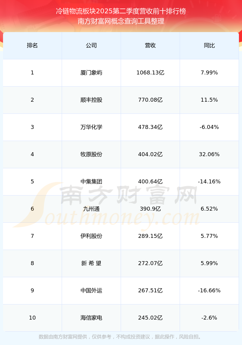 按照南方財富網(wǎng)概念查詢工具統(tǒng)計,該股所屬板塊為冷鏈物流板塊,該板塊共有145只股票,中儲股份2025第二季度營收在該板塊中排名為第14名,該板塊2025第二季度營收排名前十的股票如下表: