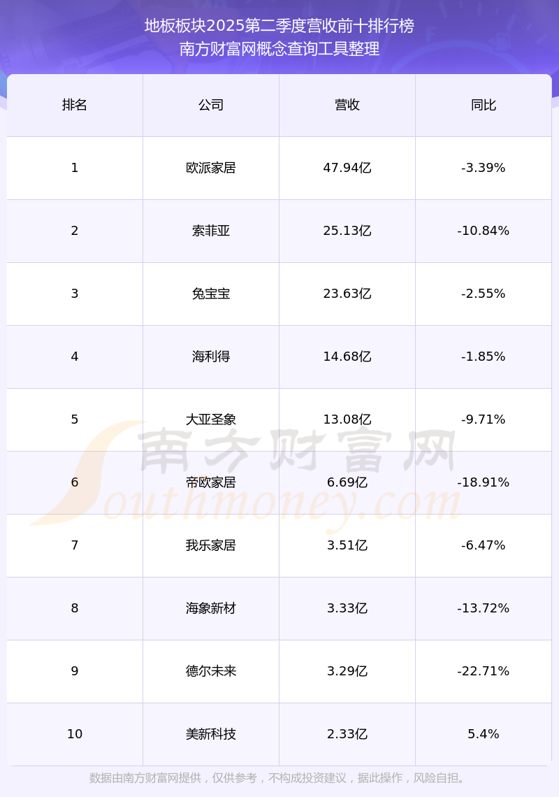 按照南方財富網(wǎng)概念查詢工具統(tǒng)計,該股所屬板塊為地板板塊,該板塊共有12只股票,愛麗家居2025第二季度營收在該板塊中排名為第11名,該板塊2025第二季度營收排名前十的股票如下表: