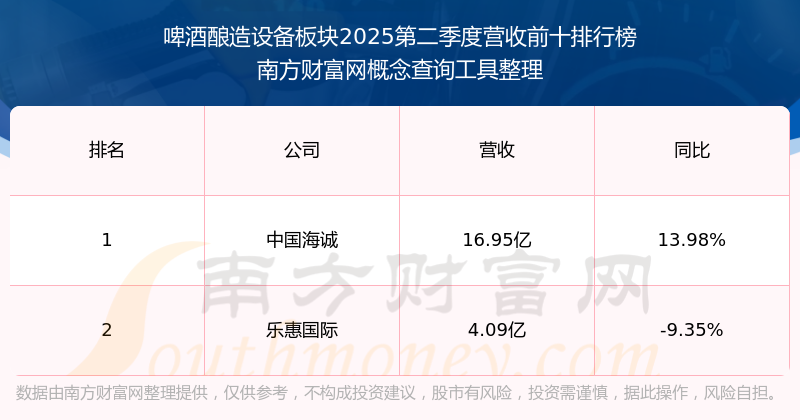 按照南方財(cái)富網(wǎng)概念查詢工具統(tǒng)計(jì),該股所屬板塊為啤酒釀造設(shè)備板塊,該板塊共有2只股票,樂惠國際2025第二季度營收在該板塊中排名為第2名,該板塊2025第二季度營收排名前十的股票如下表: