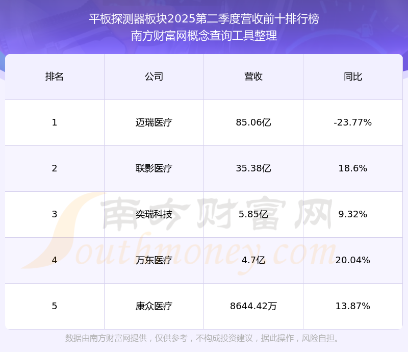按照南方財(cái)富網(wǎng)概念查詢工具統(tǒng)計(jì),該股所屬板塊為平板探測(cè)器板塊,該板塊共有5只股票,康眾醫(yī)療2025第二季度營收在該板塊中排名為第5名,該板塊2025第二季度營收排名前十的股票如下表: