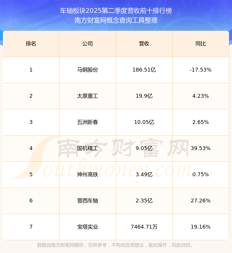 按照南方財富網(wǎng)概念查詢工具統(tǒng)計,該股所屬板塊為車軸板塊,該板塊共有7只股票,晉西車軸2025第二季度營收在該板塊中排名為第6名,該板塊2025第二季度營收排名前十的股票如下表: