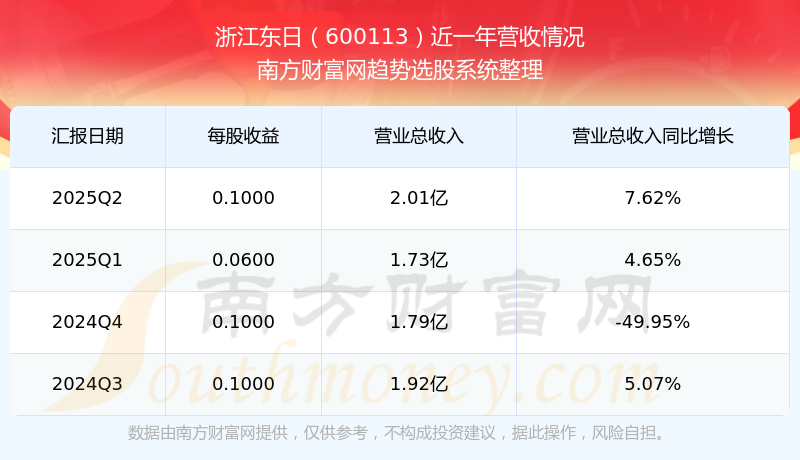 浙江東日(600113)披露2025年第二季度報告,報告期實現(xiàn)營收2.01億元,同比7.62%;歸母凈利潤4359.89萬元,同比4.43%;扣非凈利潤4256.9萬元,同比4.21%。