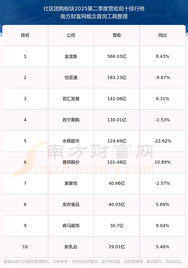 按照南方財富網(wǎng)概念查詢工具統(tǒng)計,該股所屬板塊為社區(qū)團購板塊,該板塊共有53只股票,浙江東日2025第二季度營收在該板塊中排名為第47名,該板塊2025第二季度營收排名前十的股票如下表: