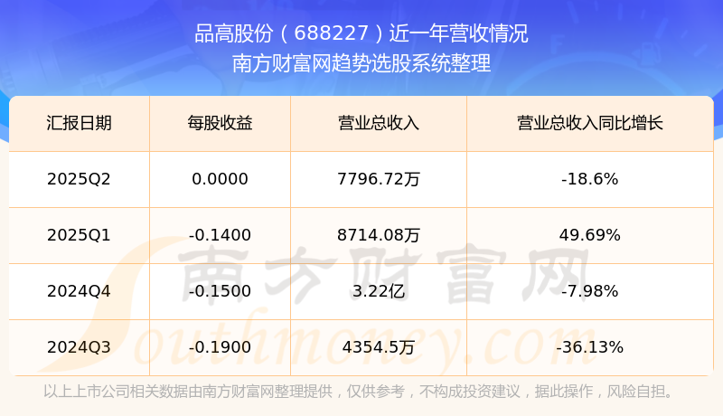 品高股份(688227)發(fā)布2025年第二季度財報。2025年第二季度品高股份實現(xiàn)營業(yè)收入7796.72萬元,同比增加-18.6元%,環(huán)比增加-10.53%;凈利潤為-25.06萬元,同比增長94.51%,環(huán)比增長98.39%。
