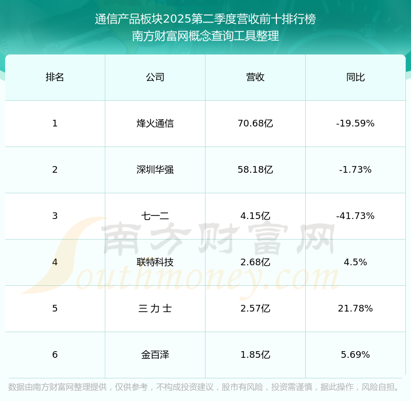 按照南方財富網概念查詢工具統(tǒng)計,該股所屬板塊為通信產品板塊,該板塊共有6只股票,映翰通2025第二季度營收在該板塊中排名為第6名,該板塊2025第二季度營收排名前十的股票如下表: