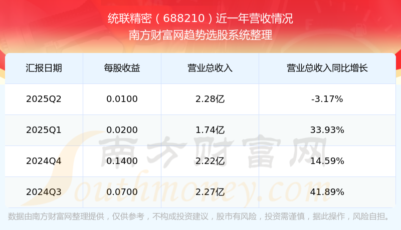 統(tǒng)聯(lián)精密披露了2025年第二季度財報。報告顯示,統(tǒng)聯(lián)精密2025年第二季度實現(xiàn)營收2.28億元,同比-3.17%;歸母凈利潤213.04萬元,同比-92.04%。