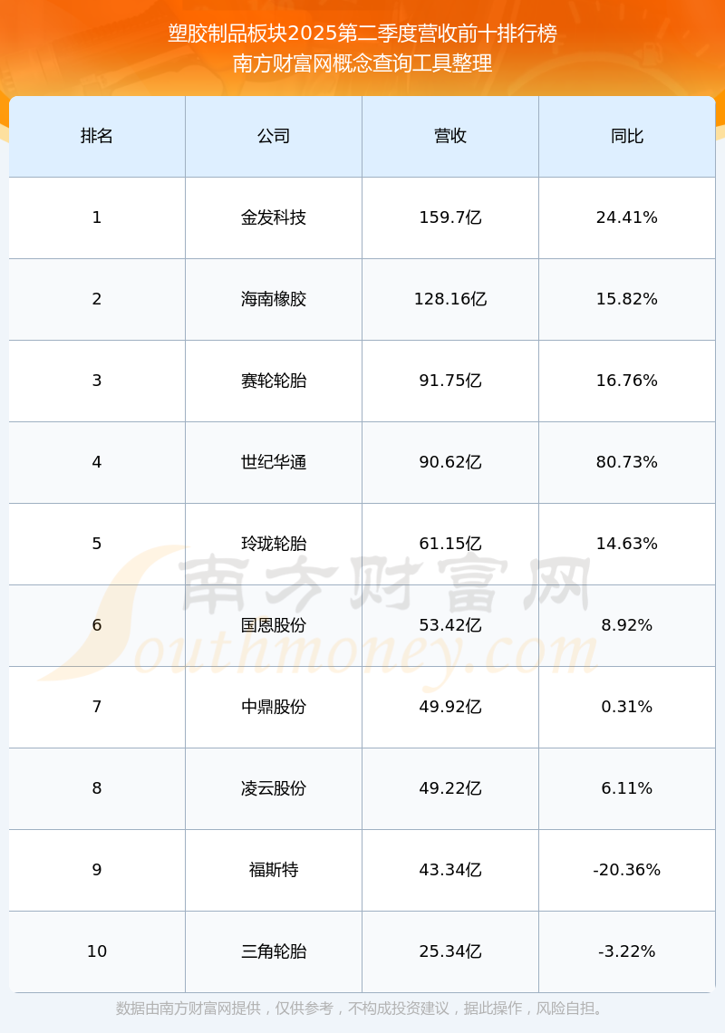 按照南方財富網(wǎng)概念查詢工具統(tǒng)計,該股所屬板塊為塑膠制品板塊,該板塊共有77只股票,統(tǒng)聯(lián)精密2025第二季度營收在該板塊中排名為第77名,該板塊2025第二季度營收排名前十的股票如下表: