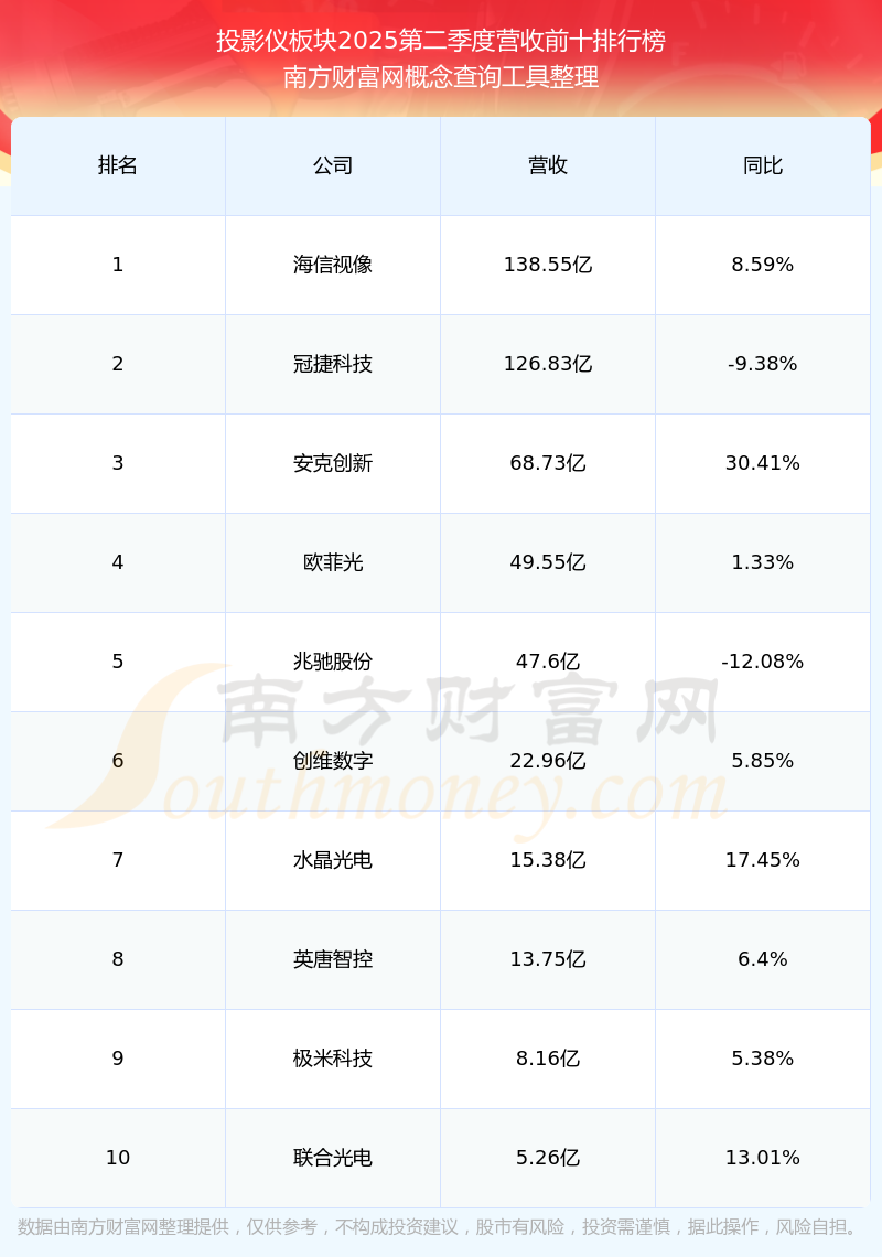 按照南方財(cái)富網(wǎng)概念查詢工具統(tǒng)計(jì),該股所屬板塊為投影儀板塊,該板塊共有15只股票,極米科技2025第二季度營收在該板塊中排名為第9名,該板塊2025第二季度營收排名前十的股票如下表: