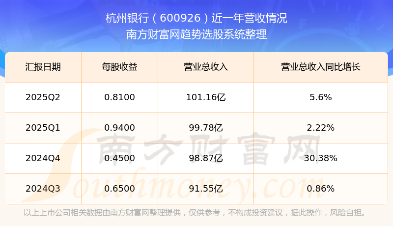 按照南方財富網(wǎng)概念查詢工具統(tǒng)計,該股所屬板塊為銀行板塊,該板塊共有44只股票,杭州銀行2025第二季度營收在該板塊中排名為第22名,該板塊2025第二季度營收排名前十的股票如下表:
