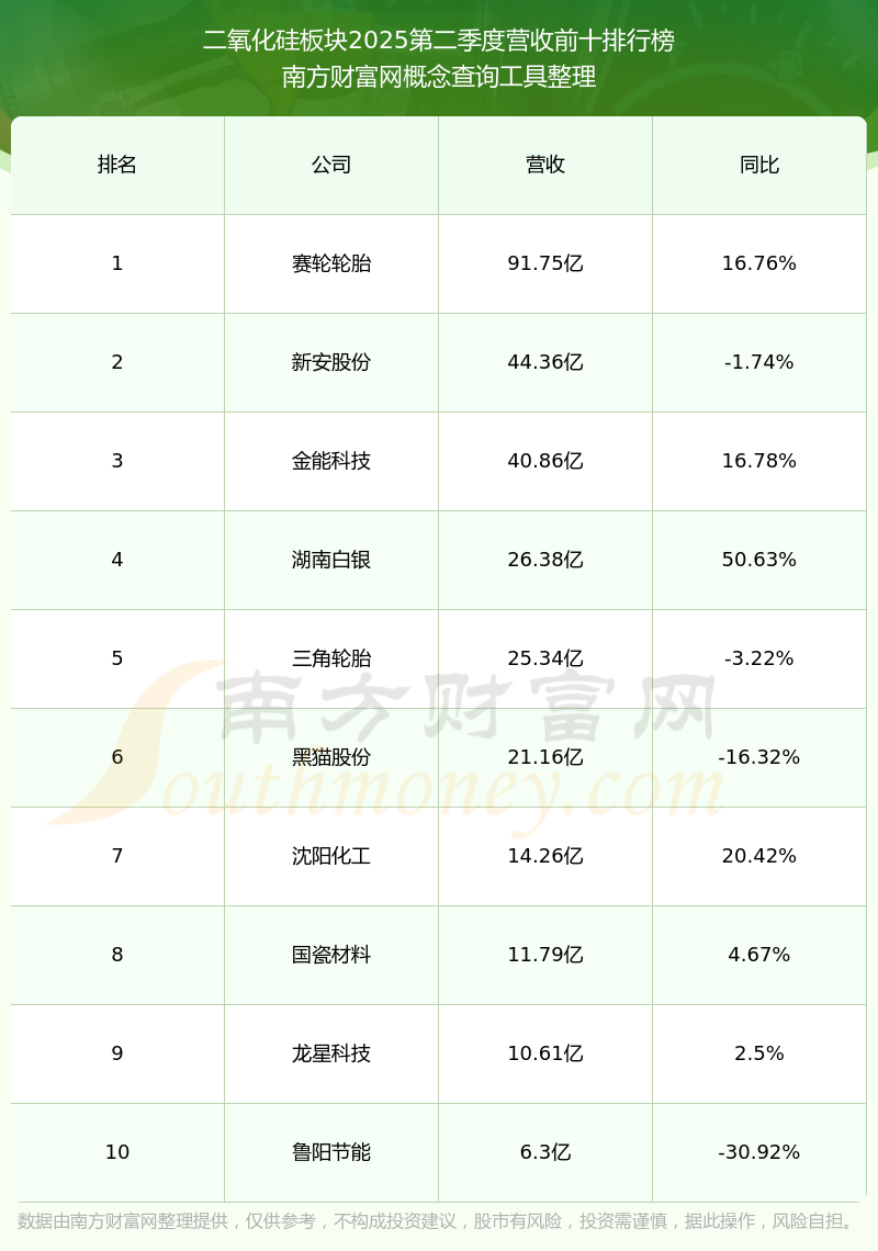 按照南方財(cái)富網(wǎng)概念查詢工具統(tǒng)計(jì),該股所屬板塊為二氧化硅板塊,該板塊共有23只股票,確成股份2025第二季度營收在該板塊中排名為第12名,該板塊2025第二季度營收排名前十的股票如下表:
