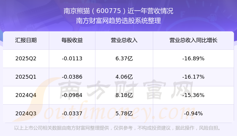南京熊貓2025年第二季度顯示,公司主營收入6.37億元,同比-16.89%;歸母凈利潤-1030.26萬元,同比53.75%;扣非凈利潤-2358.29萬元,同比10.89%;