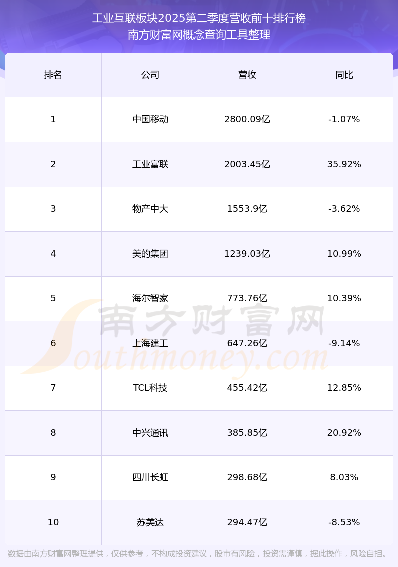 按照南方財(cái)富網(wǎng)概念查詢工具統(tǒng)計(jì),該股所屬板塊為工業(yè)互聯(lián)板塊,該板塊共有198只股票,南京熊貓2025第二季度營收在該板塊中排名為第91名,該板塊2025第二季度營收排名前十的股票如下表: