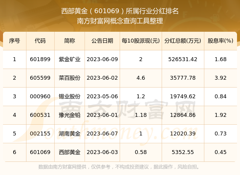 按照南方財(cái)富網(wǎng)趨勢(shì)選股系統(tǒng)統(tǒng)計(jì),西部黃金所屬行業(yè)為貴金屬行業(yè),貴金屬行業(yè)分紅排名情況如下表: