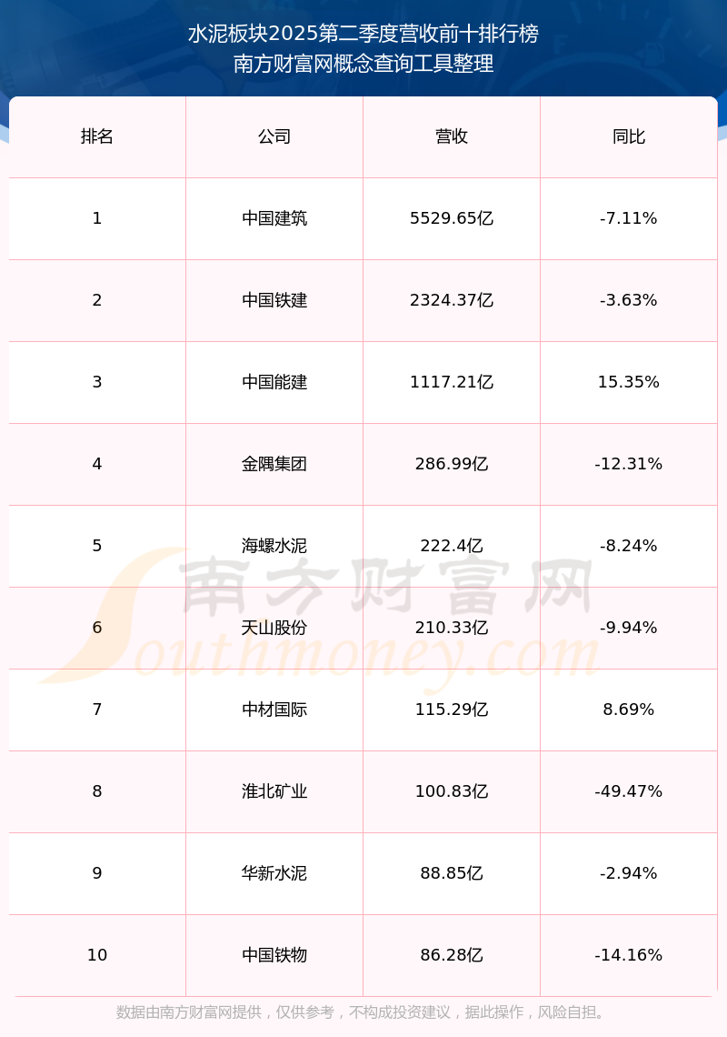 按照南方財(cái)富網(wǎng)概念查詢工具統(tǒng)計(jì),該股所屬板塊為水泥板塊,該板塊共有63只股票,寧夏建材2025第二季度營(yíng)收在該板塊中排名為第27名,該板塊2025第二季度營(yíng)收排名前十的股票如下表: