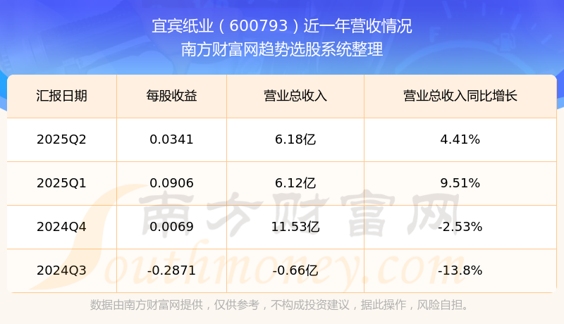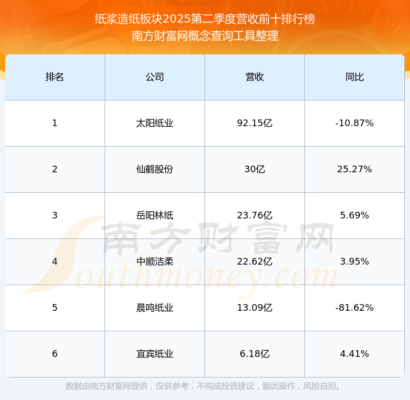 按照南方財富網(wǎng)概念查詢工具統(tǒng)計,該股所屬板塊為紙漿造紙板塊,該板塊共有6只股票,宜賓紙業(yè)2025第二季度營收在該板塊中排名為第6名,該板塊2025第二季度營收排名前十的股票如下表: