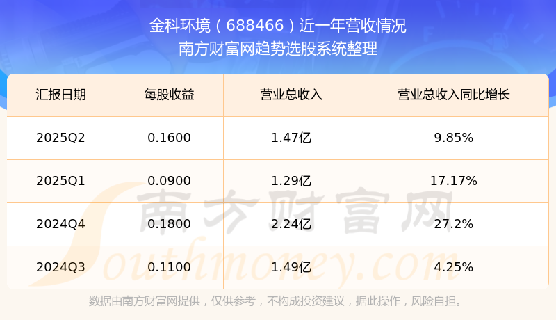 金科環(huán)境2025年第二季度財(cái)報(bào)顯示,公司主營(yíng)收入1.47億元,同比9.85%;歸母凈利潤(rùn)1900.67萬(wàn)元,同比-16.94%;扣非凈利潤(rùn)1695.97萬(wàn)元,同比-19.45%。