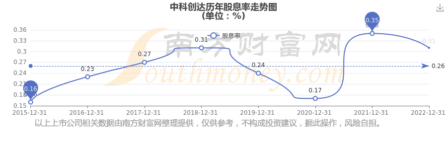 近年中科創(chuàng)達年度股息率走勢如下圖: