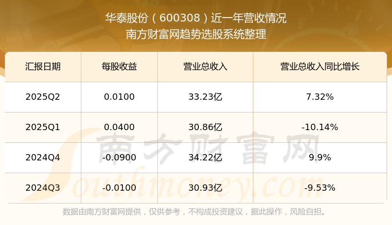 華泰股份2025年第二季度財(cái)報(bào)顯示,公司主營收入33.23億元,同比7.32%;歸母凈利潤780.87萬元,同比-88.92%;扣非凈利潤-365.49萬元,同比-106.03%;