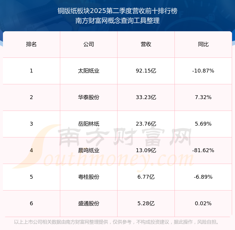 按照南方財(cái)富網(wǎng)概念查詢工具統(tǒng)計(jì),該股所屬板塊為銅版紙板塊,該板塊共有6只股票,華泰股份2025第二季度營收在該板塊中排名為第2名,該板塊2025第二季度營收排名前十的股票如下表: