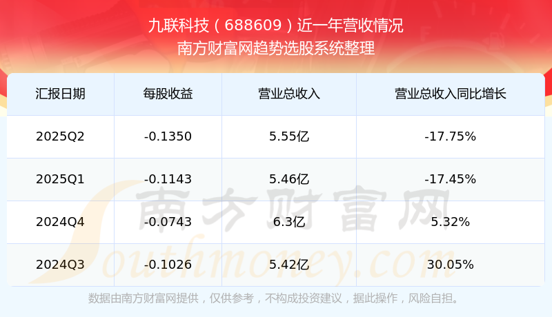 九聯(lián)科技2025年第二季度財報顯示,公司主營收入5.55億元,同比-17.75%;歸母凈利潤-6666.63萬元,同比-13.06%;扣非凈利潤-6529.2萬元,同比-12.01%;