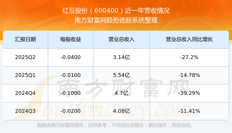 紅豆股份2025年第二季度財報顯示,公司主營收入3.14億元,同比-27.2%;歸母凈利潤-7882.45萬元,同比-2737.68%;扣非凈利潤-8186.95萬元,同比-923.64%。