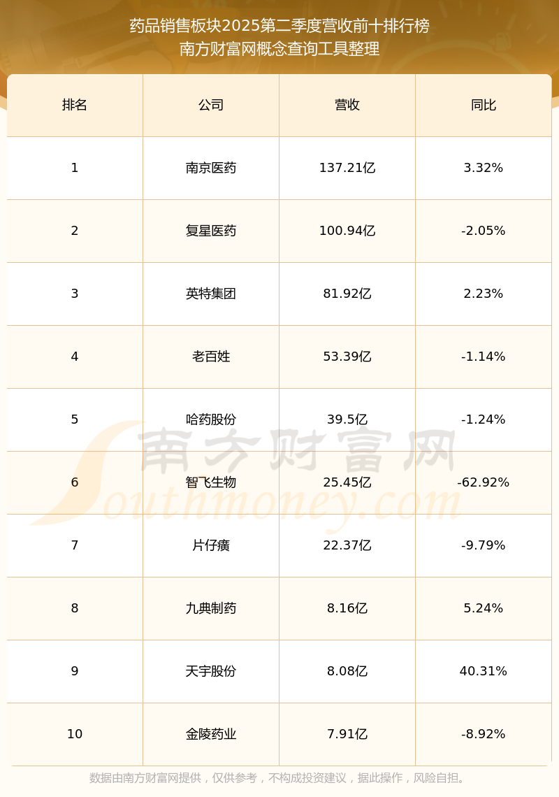 按照南方財(cái)富網(wǎng)概念查詢工具統(tǒng)計(jì),該股所屬板塊為藥品銷售板塊,該板塊共有18只股票,百奧泰2025第二季度營(yíng)收在該板塊中排名為第18名,該板塊2025第二季度營(yíng)收排名前十的股票如下表: