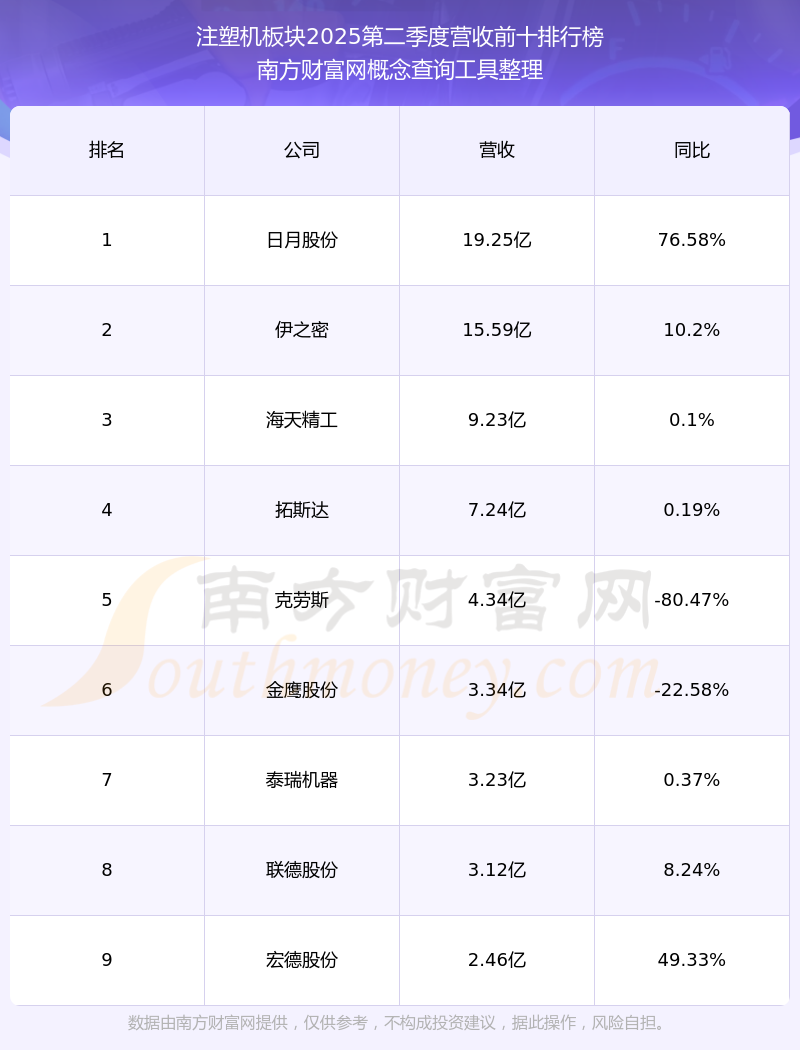按照南方財富網概念查詢工具統(tǒng)計,該股所屬板塊為注塑機板塊,該板塊共有9只股票,泰瑞機器2025第二季度營收在該板塊中排名為第7名,該板塊2025第二季度營收排名前十的股票如下表: