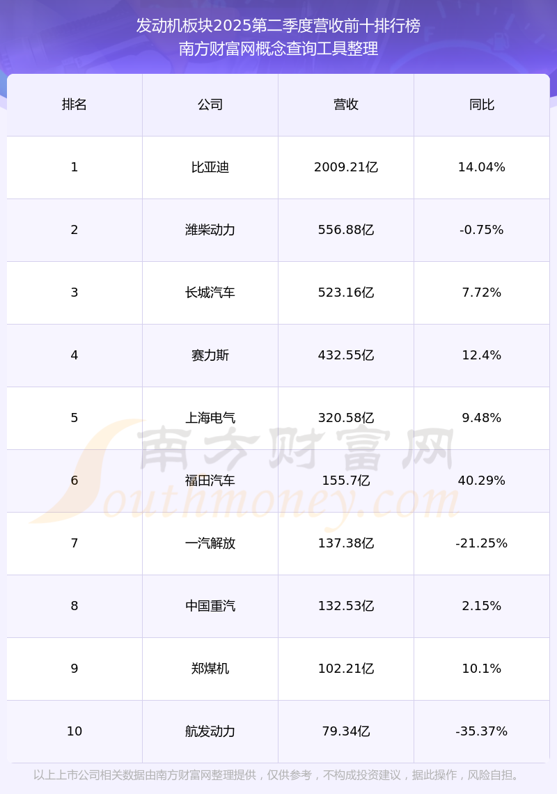 按照南方財(cái)富網(wǎng)概念查詢工具統(tǒng)計(jì),該股所屬板塊為發(fā)動(dòng)機(jī)板塊,該板塊共有118只股票,動(dòng)力新科2025第二季度營(yíng)收在該板塊中排名為第38名,該板塊2025第二季度營(yíng)收排名前十的股票如下表: