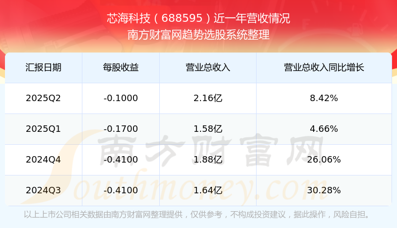 芯?萍迹688595)發(fā)布2025年第二季度財報。2025年第二季度芯?萍紝崿F(xiàn)營業(yè)收入2.16億元,同比增加8.42元%,環(huán)比增加36.08%;凈利潤為-1479.04萬元,同比增長30.86%,環(huán)比增長38.47%。