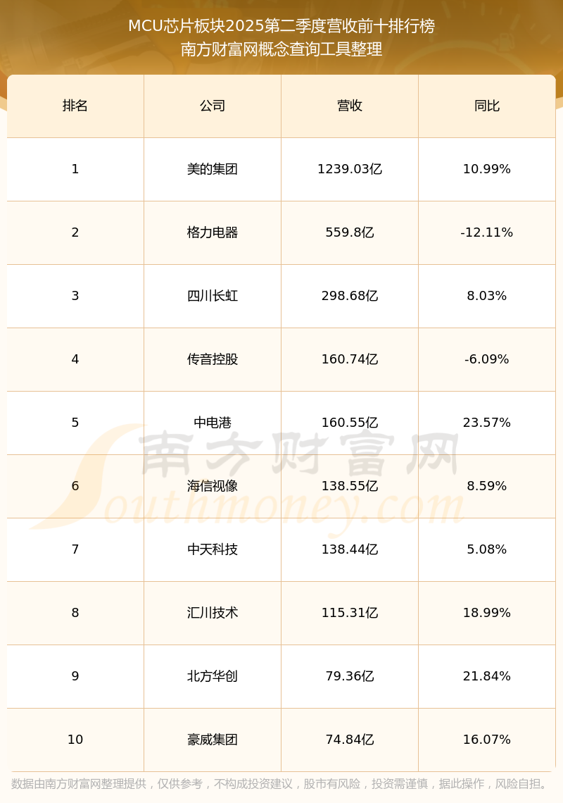 按照南方財富網(wǎng)概念查詢工具統(tǒng)計,該股所屬板塊為MCU芯片板塊,該板塊共有112只股票,芯?萍2025第二季度營收在該板塊中排名為第93名,該板塊2025第二季度營收排名前十的股票如下表:
