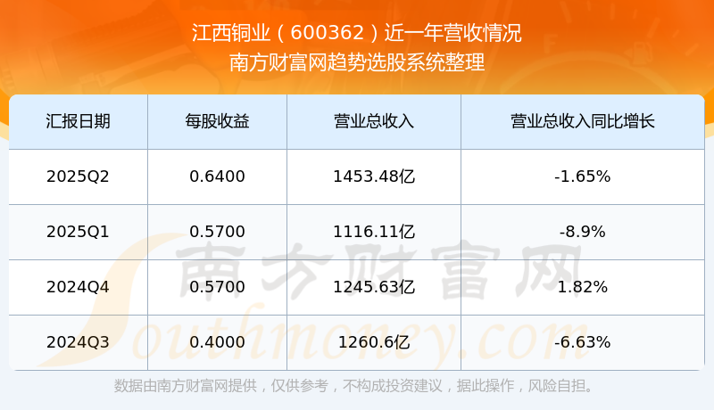 江西銅業(yè)(600362)披露2025年第二季度報告,報告期實現(xiàn)營收1453.48億元,同比-1.65%;歸母凈利潤22.22億元,同比16.84%;扣非凈利潤18.73億元,同比-40.4%;基本每股收益0.64元。