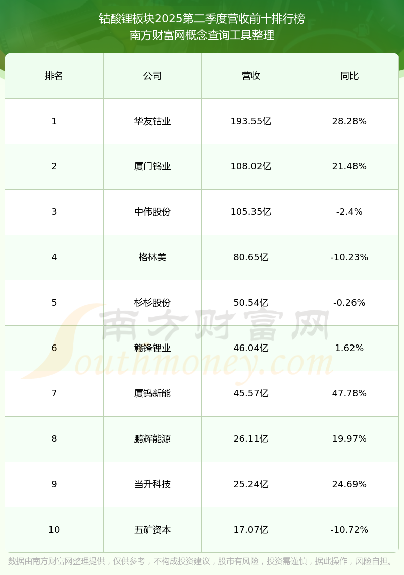 按照南方財富網(wǎng)概念查詢工具統(tǒng)計,該股所屬板塊為鈷酸鋰板塊,該板塊共有21只股票,五礦新能2025第二季度營收在該板塊中排名為第13名,該板塊2025第二季度營收排名前十的股票如下表: