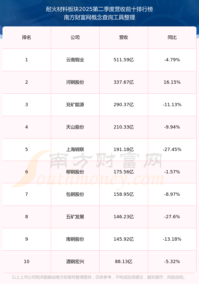 按照南方財富網(wǎng)概念查詢工具統(tǒng)計,該股所屬板塊為耐火材料板塊,該板塊共有36只股票,中鋼洛耐2025第二季度營收在該板塊中排名為第26名,該板塊2025第二季度營收排名前十的股票如下表: