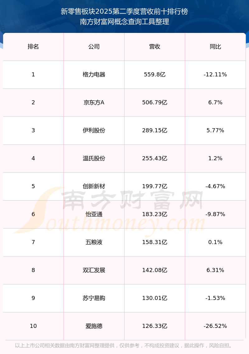 按照南方財富網(wǎng)概念查詢工具統(tǒng)計,該股所屬板塊為新零售板塊,該板塊共有205只股票,國芳集團2025第二季度營收在該板塊中排名為第173名,該板塊2025第二季度營收排名前十的股票如下表:
