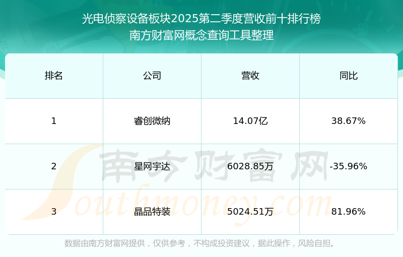按照南方財富網(wǎng)概念查詢工具統(tǒng)計,該股所屬板塊為光電偵察設(shè)備板塊,該板塊共有3只股票,晶品特裝2025第二季度營收在該板塊中排名為第3名,該板塊2025第二季度營收排名前十的股票如下表: