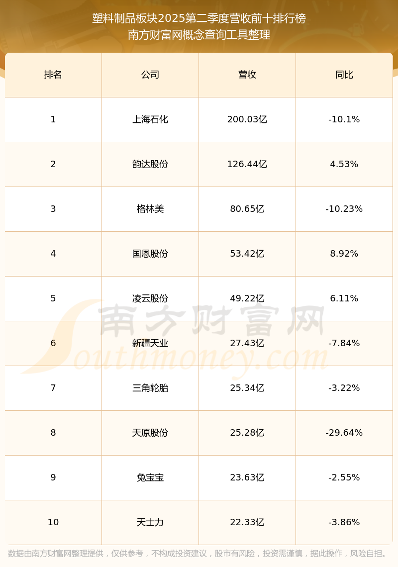 按照南方財富網(wǎng)概念查詢工具統(tǒng)計,該股所屬板塊為塑料制品板塊,該板塊共有79只股票,天龍股份2025第二季度營收在該板塊中排名為第55名,該板塊2025第二季度營收排名前十的股票如下表: