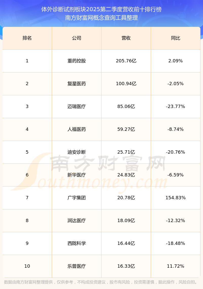 按照南方財富網(wǎng)概念查詢工具統(tǒng)計,該股所屬板塊為體外診斷試劑板塊,該板塊共有63只股票,東方生物2025第二季度營收在該板塊中排名為第38名,該板塊2025第二季度營收排名前十的股票如下表: