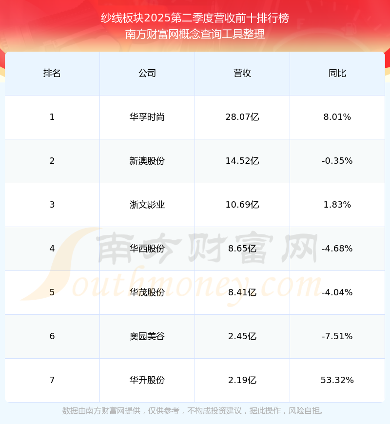 按照南方財(cái)富網(wǎng)概念查詢工具統(tǒng)計(jì),該股所屬板塊為紗線板塊,該板塊共有7只股票,百隆東方2025第二季度營收在該板塊中排名為第7名,該板塊2025第二季度營收排名前十的股票如下表: