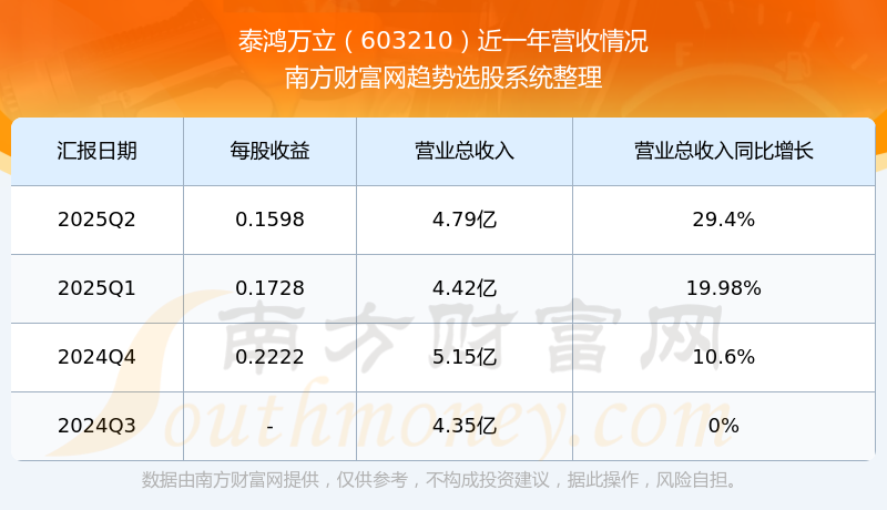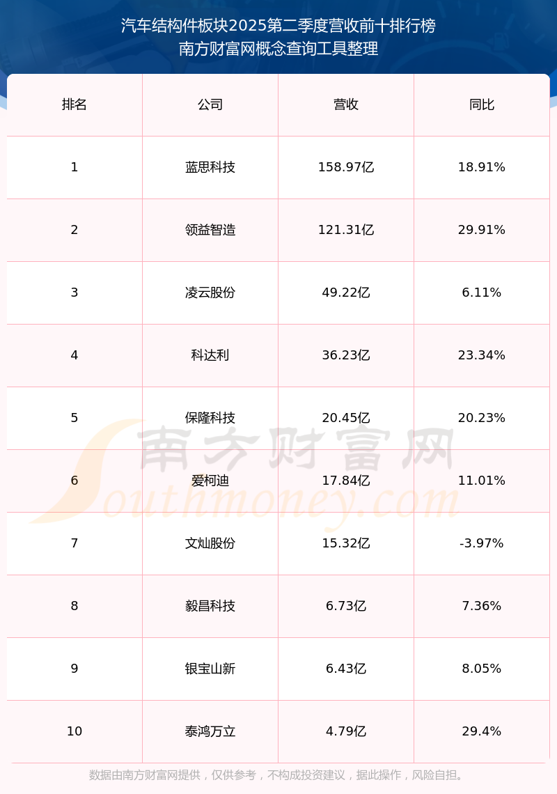 按照南方財(cái)富網(wǎng)概念查詢工具統(tǒng)計(jì),該股所屬板塊為汽車結(jié)構(gòu)件板塊,該板塊共有11只股票,泰鴻萬(wàn)立2025第二季度營(yíng)收在該板塊中排名為第10名,該板塊2025第二季度營(yíng)收排名前十的股票如下表: