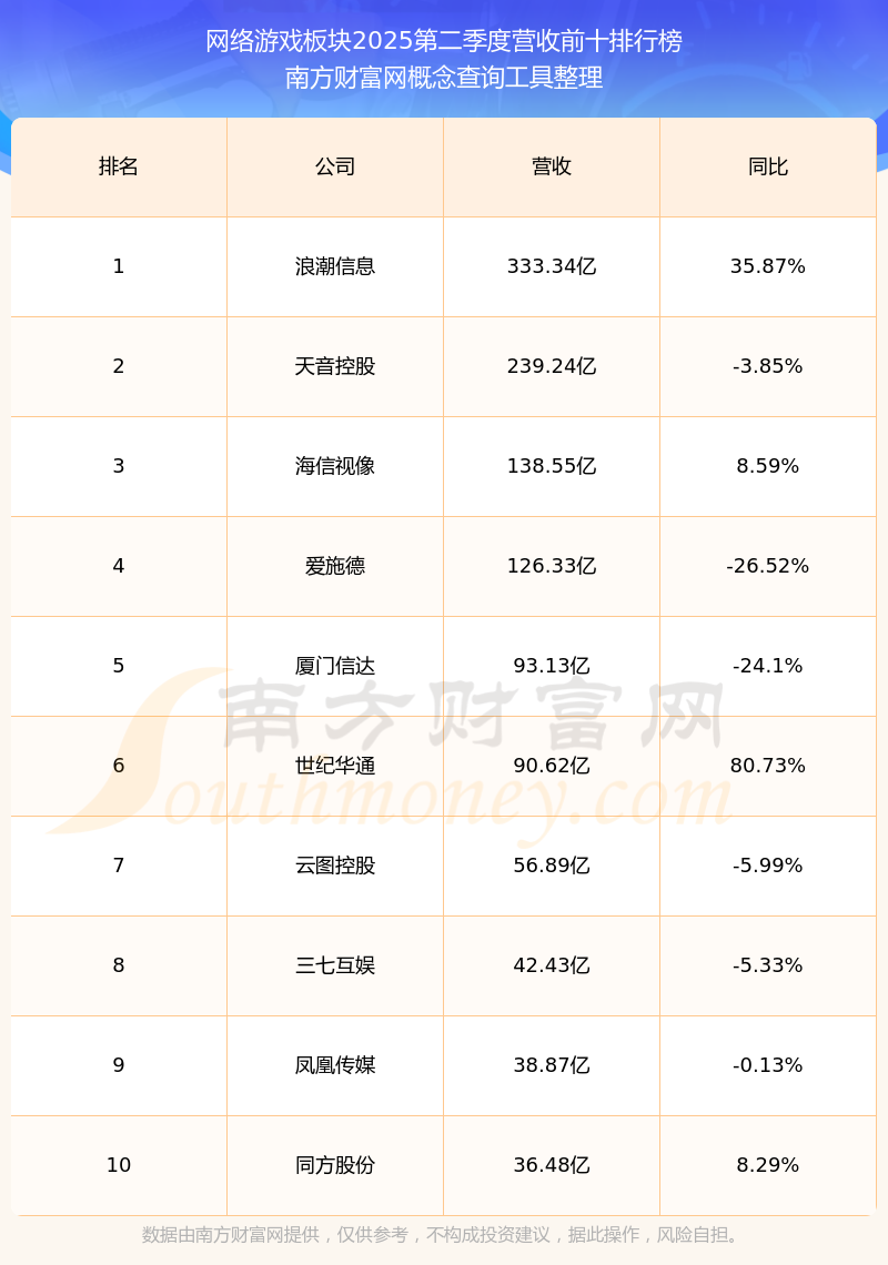 按照南方財(cái)富網(wǎng)概念查詢工具統(tǒng)計(jì),該股所屬板塊為網(wǎng)絡(luò)游戲板塊,該板塊共有140只股票,文投控股2025第二季度營收在該板塊中排名為第128名,該板塊2025第二季度營收排名前十的股票如下表: