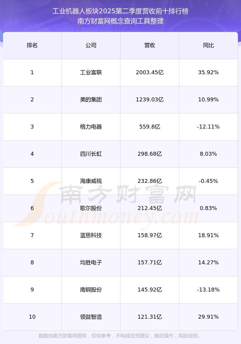 按照南方財(cái)富網(wǎng)概念查詢工具統(tǒng)計(jì),該股所屬板塊為工業(yè)機(jī)器人板塊,該板塊共有187只股票,瑞松科技2025第二季度營收在該板塊中排名為第143名,該板塊2025第二季度營收排名前十的股票如下表: