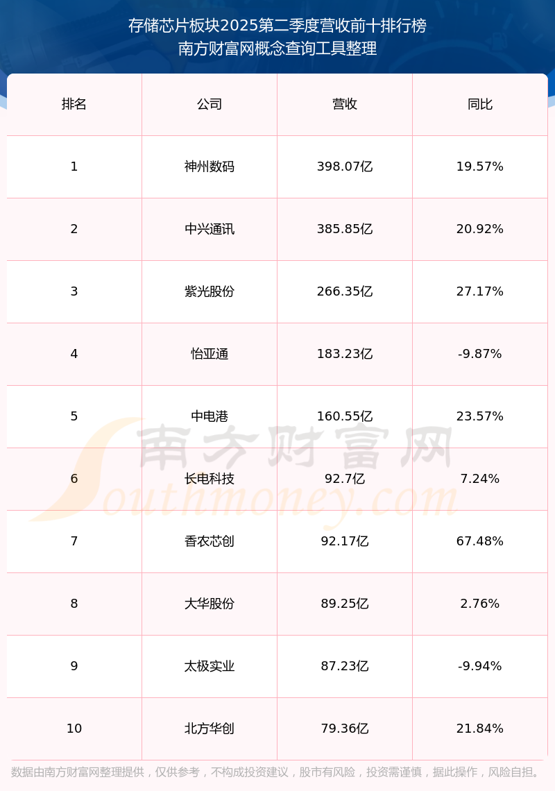 按照南方財(cái)富網(wǎng)概念查詢(xún)工具統(tǒng)計(jì),該股所屬板塊為存儲(chǔ)芯片板塊,該板塊共有143只股票,聯(lián)蕓科技2025第二季度營(yíng)收在該板塊中排名為第93名,該板塊2025第二季度營(yíng)收排名前十的股票如下表: