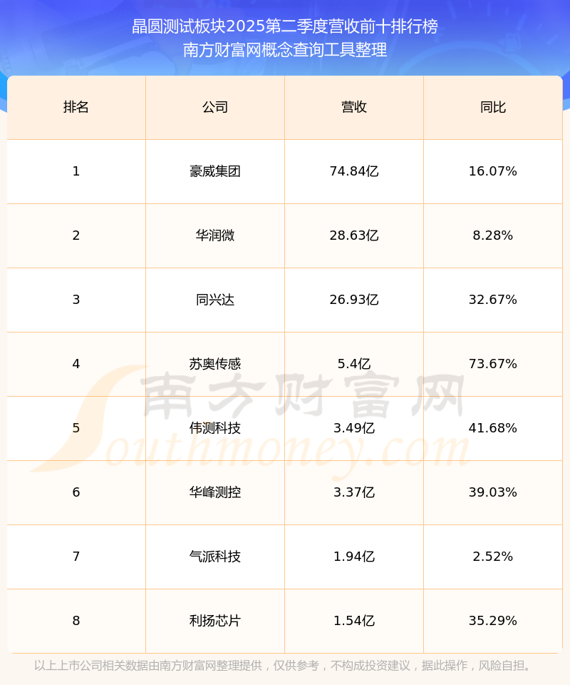 按照南方財(cái)富網(wǎng)概念查詢工具統(tǒng)計(jì),該股所屬板塊為晶圓測試板塊,該板塊共有8只股票,匯成股份2025第二季度營收在該板塊中排名為第8名,該板塊2025第二季度營收排名前十的股票如下表: