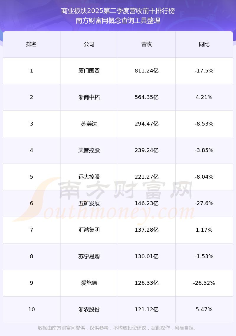 按照南方財(cái)富網(wǎng)概念查詢(xún)工具統(tǒng)計(jì),該股所屬板塊為商業(yè)板塊,該板塊共有69只股票,南京新百2025第二季度營(yíng)收在該板塊中排名為第69名,該板塊2025第二季度營(yíng)收排名前十的股票如下表: