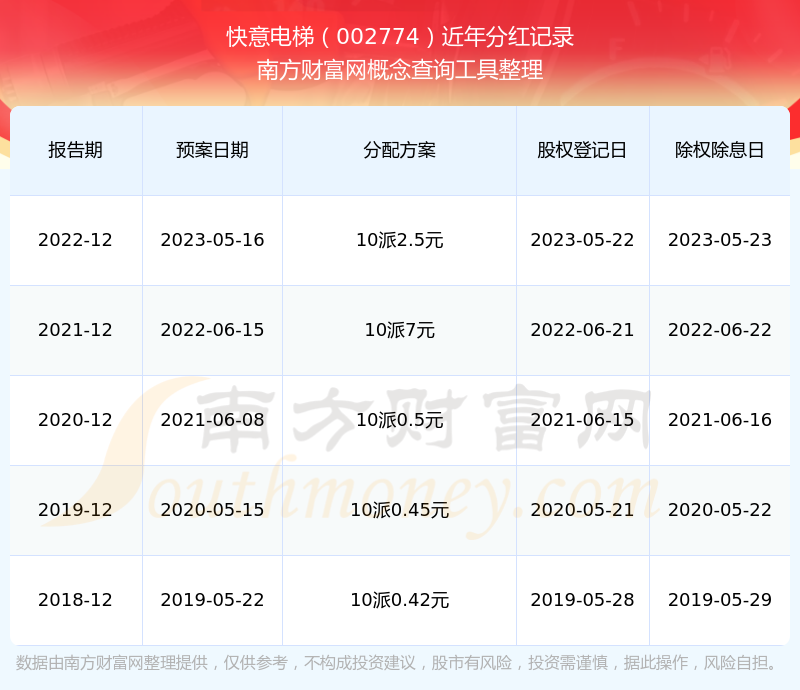 快意電梯最新一次公布的分紅方案為10派2.5元。本次權(quán)益分派股權(quán)登記日為2023年5月22日,除權(quán)除息日為2023年5月23日,派息日為2023年5月23日。
