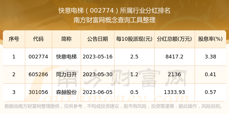 按照南方財(cái)富網(wǎng)趨勢(shì)選股系統(tǒng)統(tǒng)計(jì),快意電梯所屬行業(yè)為電梯行業(yè),電梯行業(yè)分紅排名情況如下表: