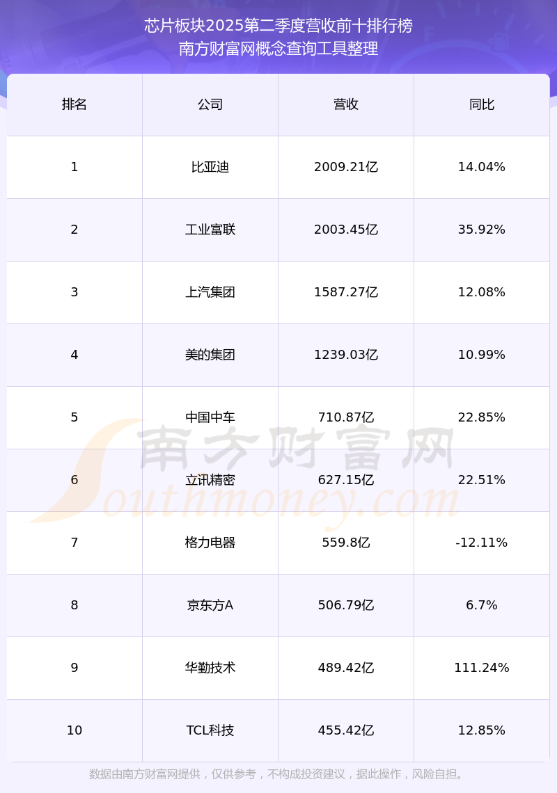 按照南方財(cái)富網(wǎng)概念查詢工具統(tǒng)計(jì),該股所屬板塊為芯片板塊,該板塊共有913只股票,晶晨股份2025第二季度營收在該板塊中排名為第168名,該板塊2025第二季度營收排名前十的股票如下表: