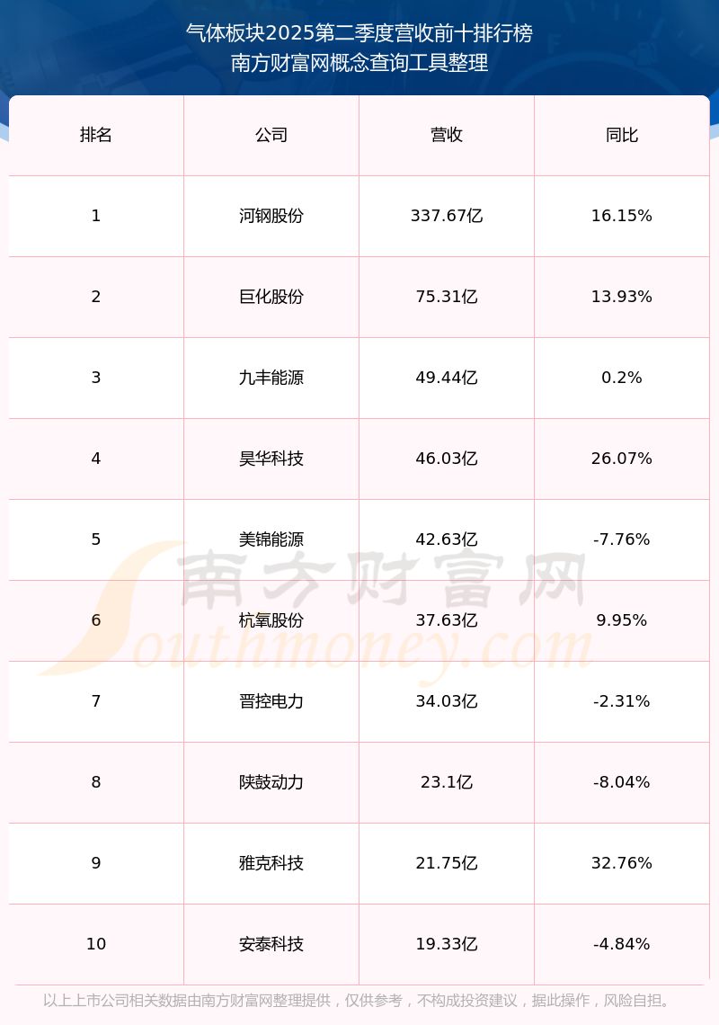 按照南方財富網(wǎng)概念查詢工具統(tǒng)計,該股所屬板塊為氣體板塊,該板塊共有43只股票,恒通股份2025第二季度營收在該板塊中排名為第43名,該板塊2025第二季度營收排名前十的股票如下表: