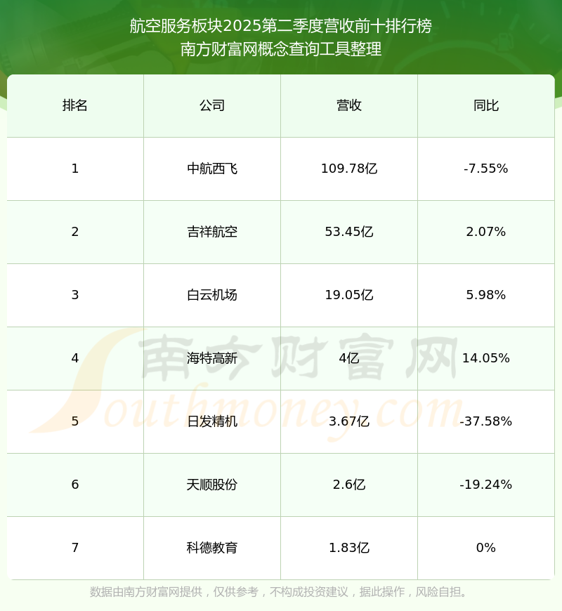 按照南方財(cái)富網(wǎng)概念查詢(xún)工具統(tǒng)計(jì),該股所屬板塊為航空服務(wù)板塊,該板塊共有7只股票,白云機(jī)場(chǎng)2025第二季度營(yíng)收在該板塊中排名為第3名,該板塊2025第二季度營(yíng)收排名前十的股票如下表: