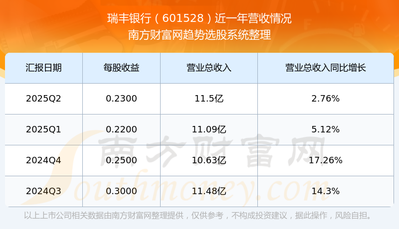 2025年第二季度,瑞豐銀行營收同比2.76%,凈利潤同比4.6%。